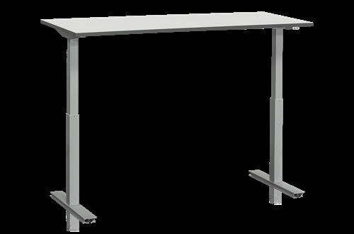 Komplet motoriseret skrivebord med bordplade i laminat (1200x800x24 mm). Maksimal belastning 90 kg fordelt vægt. Minimumshøjde 680 mm, maksimal højde 1180 mm. Stativet leveres som standard i sølvgråt lakeret stål.