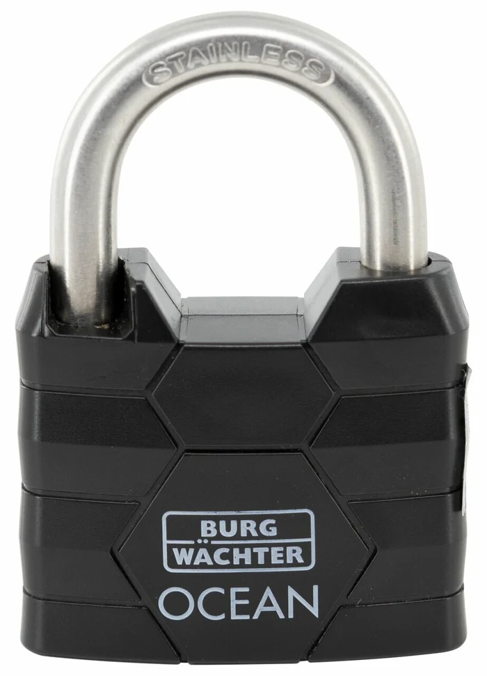 Ocean-låsen har et solidt, belagt messinghus og er ideel til sikring af porte og meget mere. Låsens bøjle er lavet af hærdet stål og har en dobbelt låsemekanisme for ekstra sikkerhed. Selve låsen er fuldstændig rustfri, hvilket garanterer langvarig funktionalitet – perfekt selv i krævende miljøer. Den innovative plastbeklædning, der består af 70% genbrugsmateriale, beskytter også låsen mod ydre påvirkninger såsom stød eller ridser, samtidig med at den beskytter overfladen på de genstande, der skal sikres. Det store antal mulige låsemuligheder giver endnu mere sikkerhed. Den fås også med et centrallåsesystem.