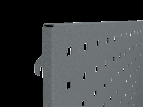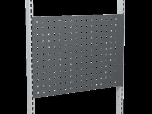 Perforeret værktøjspanel til montering på perforeret stolper eller vægskinner. Panelet monteres tæt mod søjlen for at reducere raslen. Pladetykkelse 1,5 mm, hulmål 9x9 mm og hulafstand c/c 38 mm. 14 mm foldet kant hele vejen rundt.