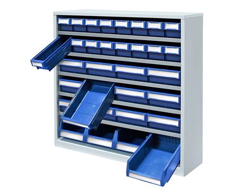 BLEVA Stålskab m/32 stk. kasser/bakker ARCA 9111/9113 Dim.: 400 x 980 x 1000 mm. Farve: Grå m/blå bakker Cl. Enhed: 1 stk. Palleenhed: 4 stk. Artnr.: 268004