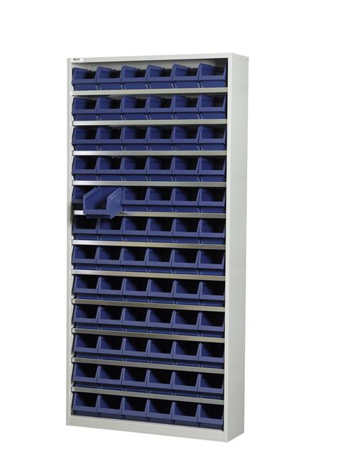 BLEVA Stålskab m/72 stk. blå PPS 3074 forrådsbakker Dim.: 250 x 950 x 2000 mm. Farve: Grå m/blå bakker Cl. Enhed: 1 stk. Palleenhed: 3 stk. Artnr.: 268051