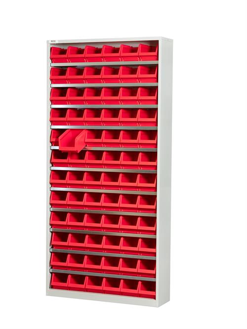 BLEVA Stålskab m/72 stk. røde PPS 3074 forrådsbakker Dim.: 250 x 950 x 2000 mm. Farve: Grå m/røde bakker Cl. Enhed: 1 stk. Palleenhed: 3 stk. Artnr.: 268052