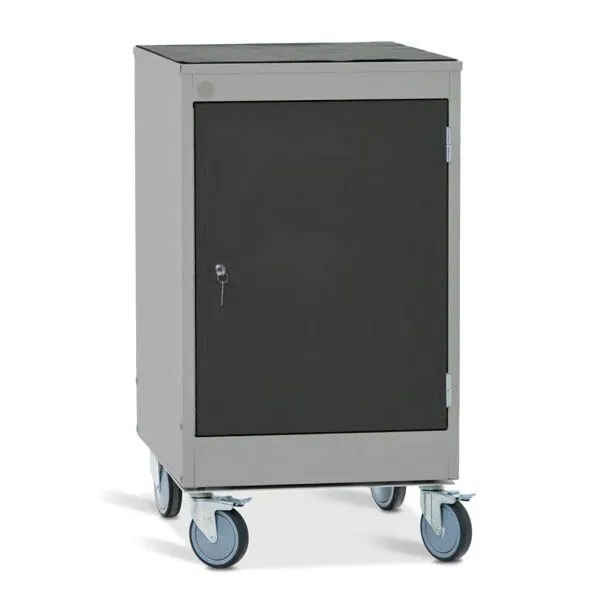 Et robust værkstedsskab/opbevaringsskab fremstillet i en helsvejst konstruktion af stålplader og med 2 faste og 2 drejbare hjul m. bremse. Et kraftigt opbevaringsskab, hvor let værktøj kan opbevares - tilpasset krævende miljøer som værksteder og lager. Det egner sig også som kontorskab. Skabet leveres med 1 grålakeret hylder. Det er lakeret i grå og antracitgrå nuancer. Den mørke nuance på dørene for at mindske risikoen for smuds og fingeraftryk.