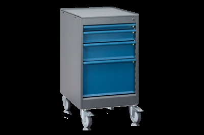 Skuffeelement med fire skuffer. 1x50 mm, 1x100 mm, 1x150 mm og 1x300 mm. Indvendige skuffemål: bredde 450 mm, dybde 600 mm. Vores skuffeelementer har kuglelejeudtræk. 100 % udtræk. Skufferne har et integreret håndtag i buet stålplade. Centrallås af chassis, der låser alle skuffer. Letmonterede skuffelåse med individuel låsning på hver skuffe. Maksimal belastning 45 kg fordelt vægt pr. skuffe.
