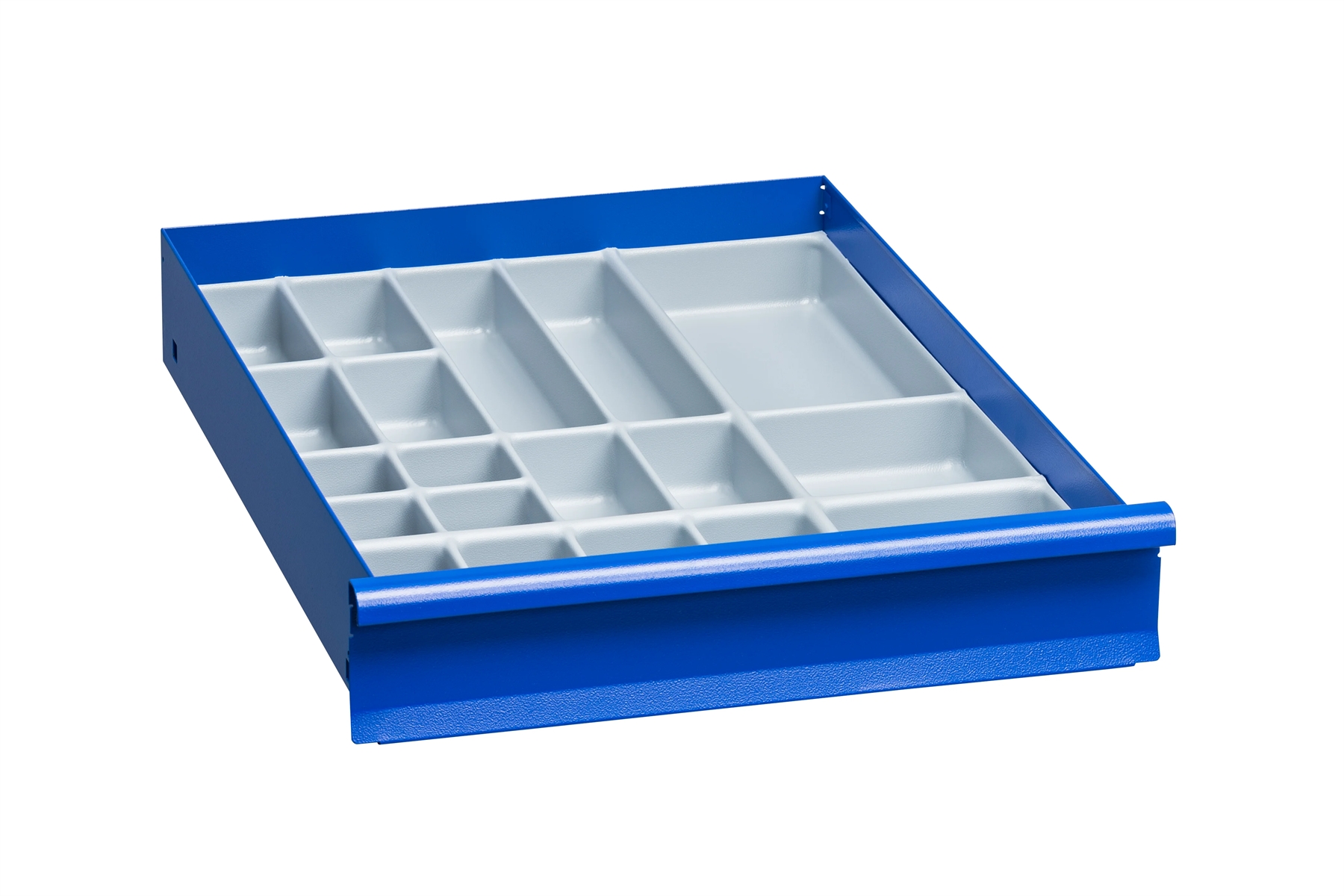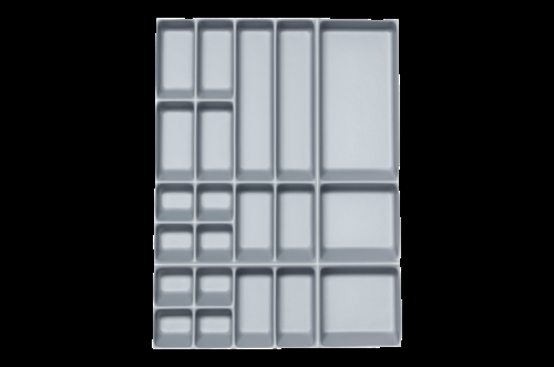 Skuffeindsats i grå polystyrenplast. Skrå kanter i skuffeindsatsen for nemmere opsamling af ting som skruer og møtrikker. Indsatsen består af følgende rum: 8 x 60x60 mm 4 x 140x60 mm 4 x 130x60 mm 2 x 290x60 mm 2 x 140x150 mm 1 x 290x150 mm.