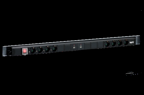 Komplet strømskinne fremstillet i aluminiumsprofil. Strømskinnen har en oplyst afbryder og er monteret på en metalplade, der nemt fastgøres på bagsiden af en perforeret stolpe 900 mm cc. Leveres med et 1,8 m tilslutningskabel (3x1,5 mm²) med et EU-stik. 220V-250V, 10A, maks. 2500W.