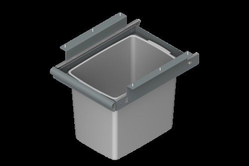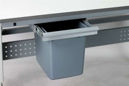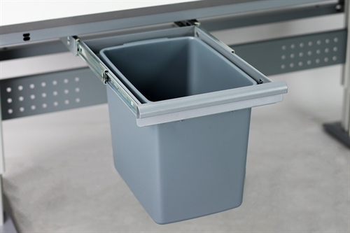 Udtrækkelig affaldsbeholder designet til montering under bordpladen på en arbejdsbænk. Beholderen monteres under bordpladen med træskruer og er fuldt udtrækkelig for nem håndtering og tømning. Selve beholderen er lavet af plastik med en kapacitet på 25 liter, mens rammen er lavet af metalplade.