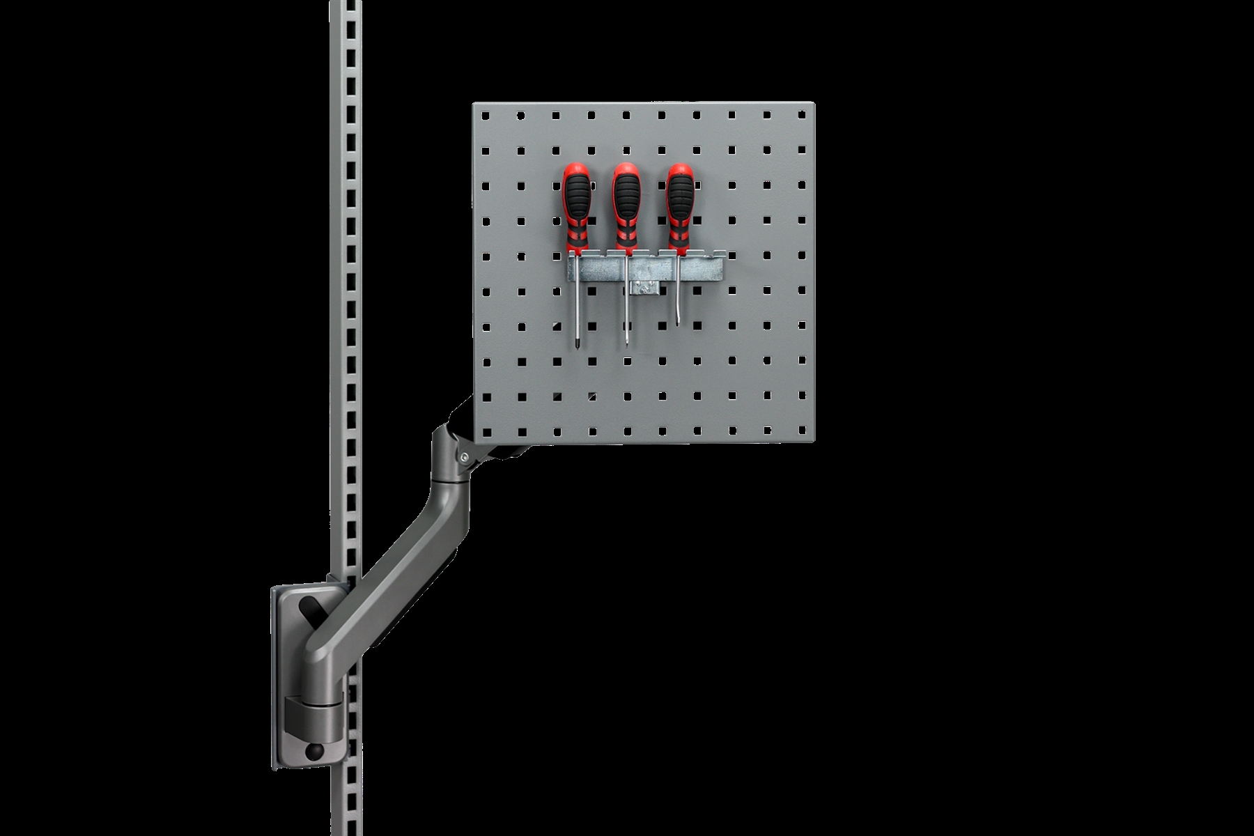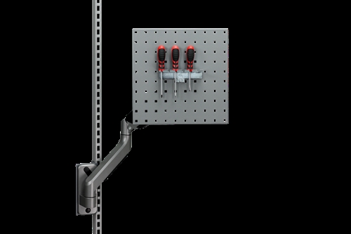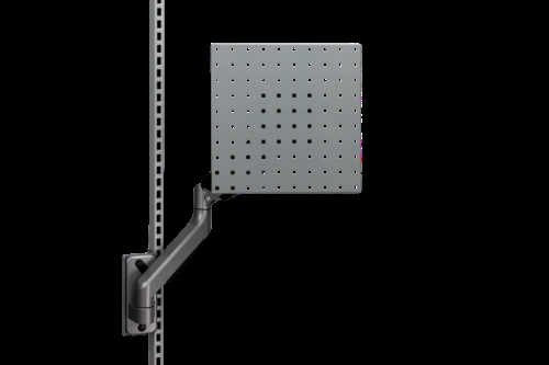 Perforeret panel på fleksibel gasfjederarm. Justerbar hældning og en belastningskapacitet på op til 15 kg. Monteret på perforeret stolpe med ophængsbeslag. Ophængsbeslag medfølger.