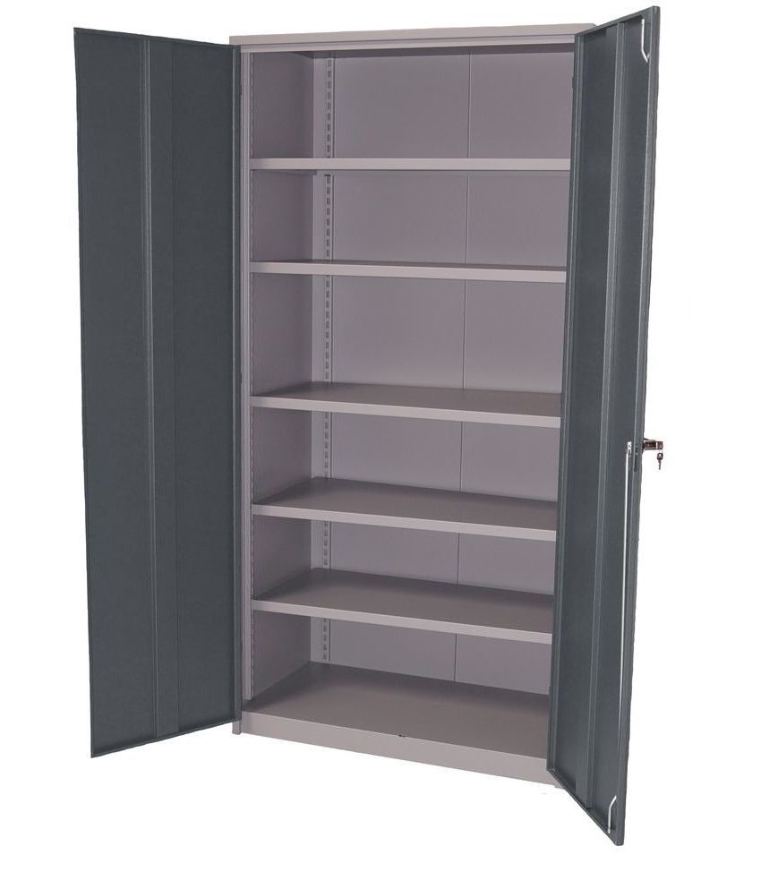 Et robust værkstedsskab fremstillet i en helsvejst konstruktion af stålplader. Et meget kraftigt værkstedsskab, hvor tungt værktøj og maskiner kan opbevares - tilpasset krævende miljøer som værksteder og lager. Det egner sig også som kontor- eller arkivskab. Skabet er udstyret med justerbare fødder, som gør at det står stabilt også er på ujævnt underlag og det holder til en maks. belastning på 500 kg. Det er lakeret i grå nuancer. Den mørke nuance på dørene for at mindske risikoen for smuds og fingeraftryk.