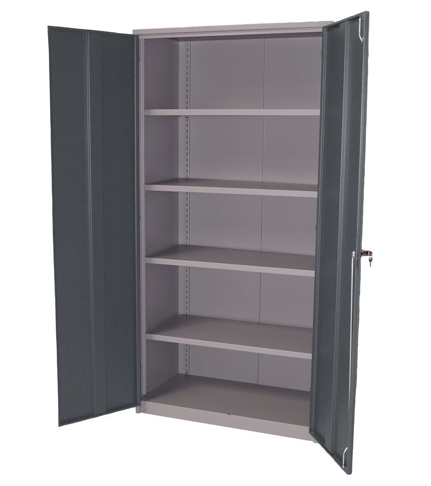 Et robust værkstedsskab fremstillet i en helsvejst konstruktion af stålplader. Et meget kraftigt værkstedsskab, hvor tungt værktøj og maskiner kan opbevares - tilpasset krævende miljøer som værksteder og lager. Det egner sig også som kontor- eller arkivskab. Skabet er udstyret med justerbare fødder, som gør at det står stabilt også er på ujævnt underlag og det holder til en maks. belastning på 500 kg. Det er lakeret i grå nuancer. Den mørke nuance på dørene for at mindske risikoen for smuds og fingeraftryk.