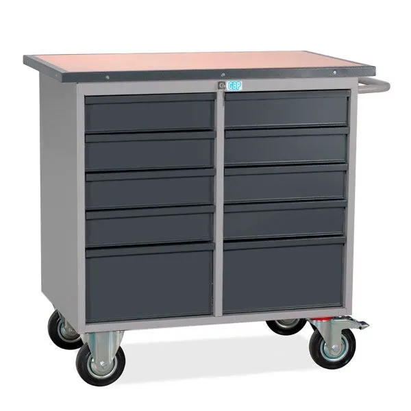 Værkstedsvogn m/10 skuffer.. Vognen kan belastes med max. 325 kg. og hver enkelt skuffe med 40 kg. Leveres m. lakeret krydsfiner bordplade med nedfræset stålkant rundt om hele arbejdsfladen. Skuffer er nemt udtræksbare og køre på kuglelejer. I hver skuffe er der ilagt en gummimåtte. Skabet leveres med ens nøglelås til alle skuffer.. Der er 2 faste hjul samt 2 drejelige hjul m. bremse.