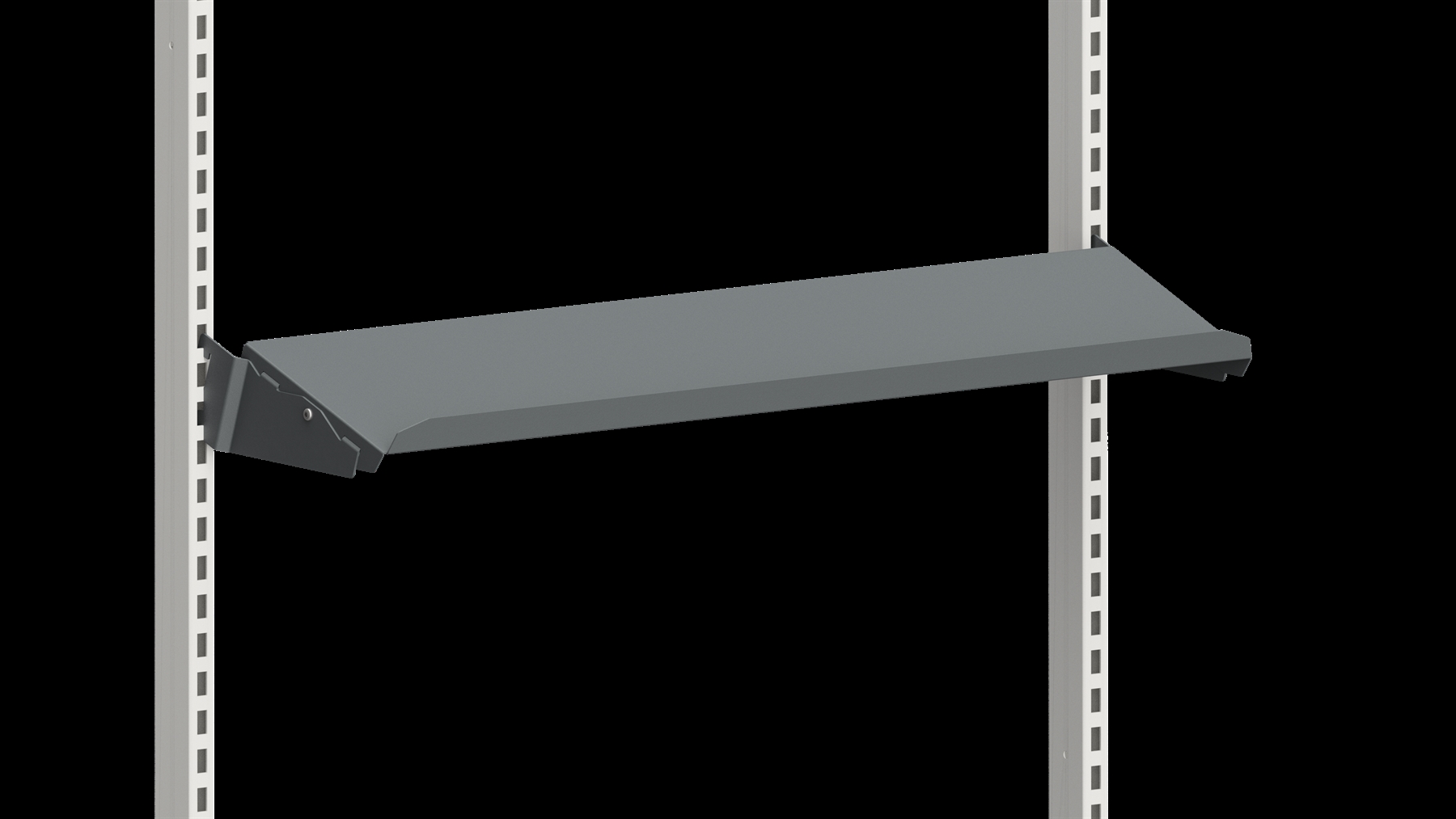 BLEVA Værktøjshylde monteres i perforeret stolper. Er anvendelig til opbevaring af værktøjer, plastkasser mm. Kan monteres vinklet. Omkring er opbukket kant. Leveres inkl. konsuljern.